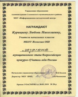 Курицына Л. Н. прошла в очный тур муниципального этапа Всероссийского конкурса "Учитель года 2018" | |